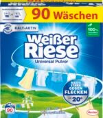 Weißer Riese Universal Pulver (90 Waschladungen), Vollwaschmittel wirkt riesig stark gegen Flecken, Kalt-Aktiv schon ab 20° C, ergiebiges Waschpulver, ideal für Familien mit Kindern
